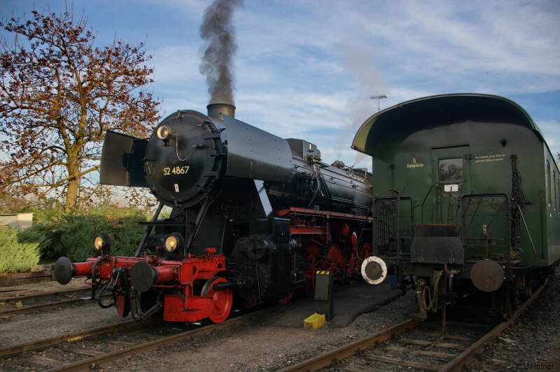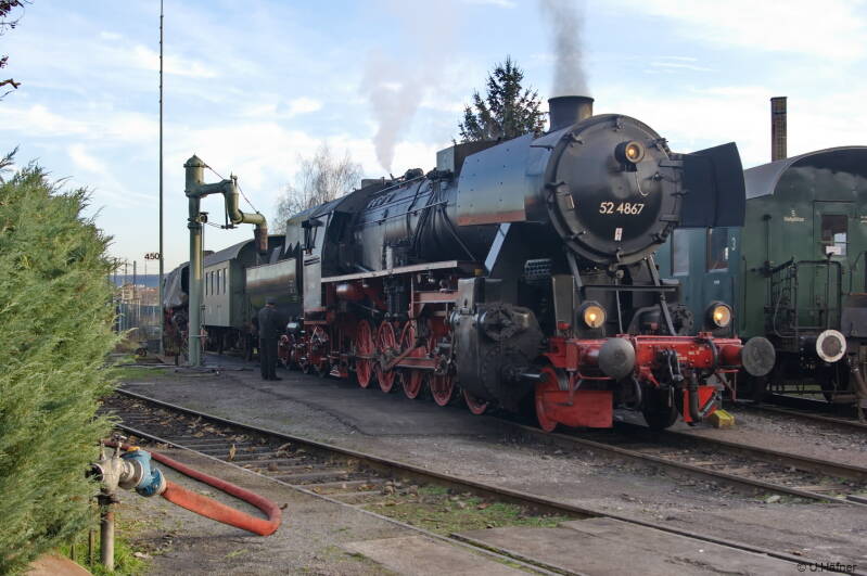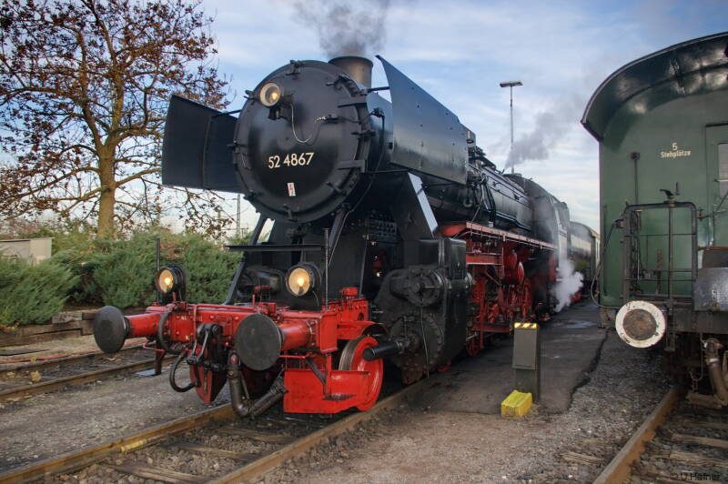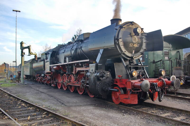 In Babelsberg gebaut (Fabr. Nr. 13919). Erstheimat im Rbd Dresden Bw Komotau. Nach 1945 landete 52 4867 in Österreich dort erhielt die Lokomotive nach ÖBB Schema die Nr. 152.4867, die 1 in der Betriebsnummer erhalten Lokomotiven mit Barrenrahmen. 1970 wurde sie an die Graz-Köflacher-Eisenbahn- und Bergbaugesellschaft verkauf und bis 1978 eingesetzt. 1980 kaufte die Historische Eisenbahn Frankfurt E. V. die 152.4867 von der GKB. Der Kabinentender wurde bei der Aufarbeitung gegen einen Orginal Tender getauscht, auch ein Standard Schornstein hatte man angebracht. 2003 gab es einen neuen geschweißten Kessel.