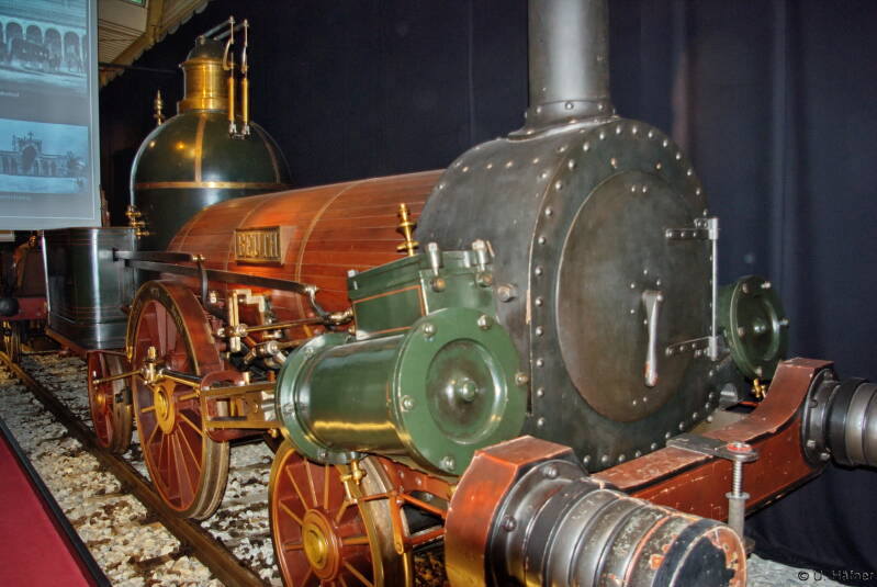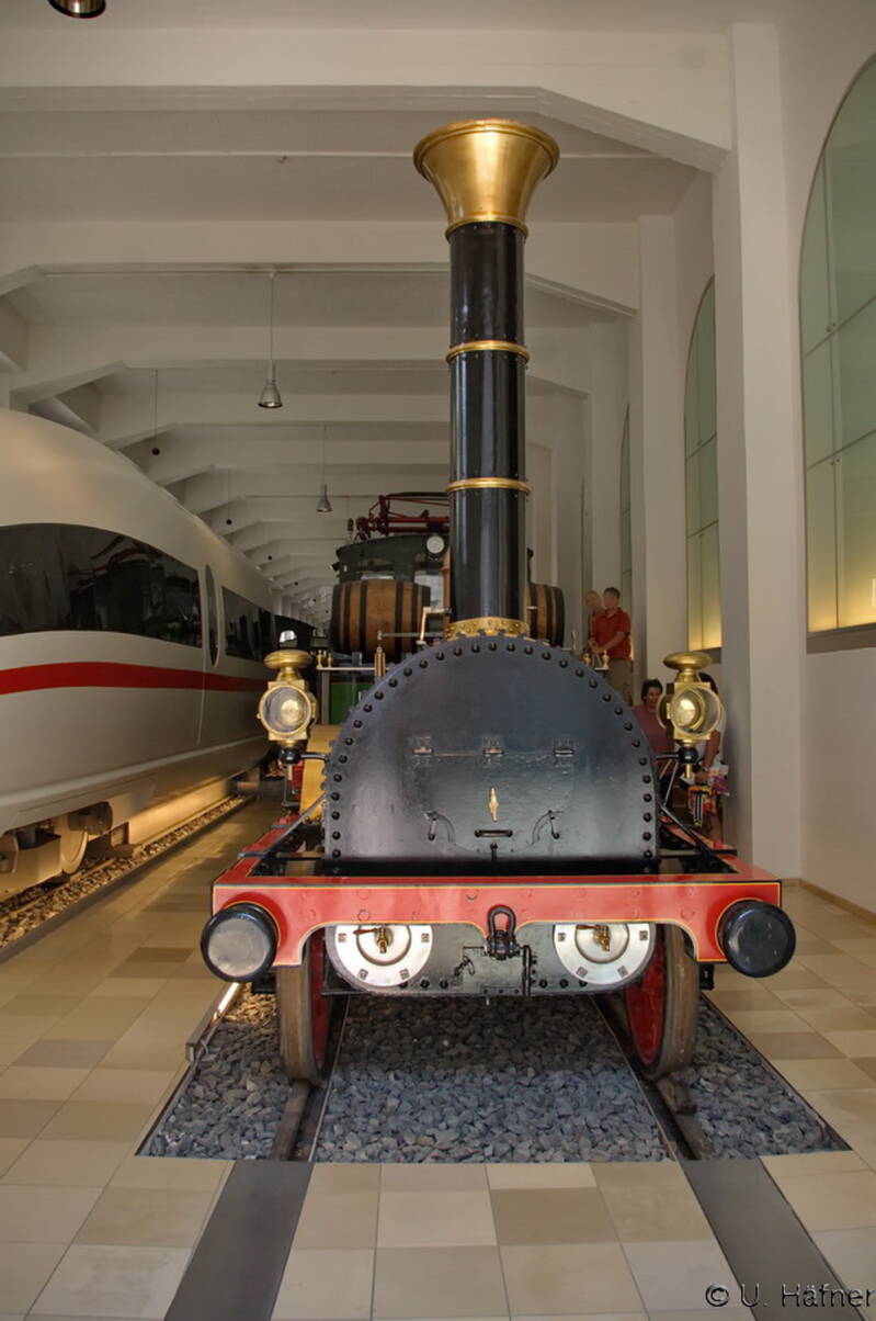 Das Ausstellungsstück ist ein Nachbau der ersten in Deutschland gefahrenen Lokomotive. Gefertigt 1952 von Ausbildungswerkstätten der Deutschen Bundesbahn.
