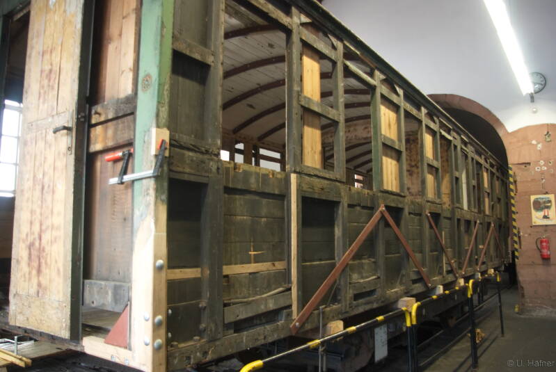 Durchgangswagen der K.Bay.Sts.B. eingesetzt als 3te. Klasse, ab 1918 wurden die unbequemen Wagen zur 4ten. Klasse herabgesetzt. Hersteller ist vermutlich MAN um 1873. Die meisten Wagen wurden ab 1924 ausgemustert so das 1930 nur noch vier Wagen in Bestand der Reichsbahn waren. Der Wagen Diente viele Jahre als Behelfsunterkunft in Deggendorf und musste auch kurze Zeit als Hühnerstall herhalten. 1988 wurde er von Modell-Eisenbahn-Verein Deggendorf geborgen. Der Wagenkasten steht auf dem Fahrgestell des TAG2 (Baujahr 1883).