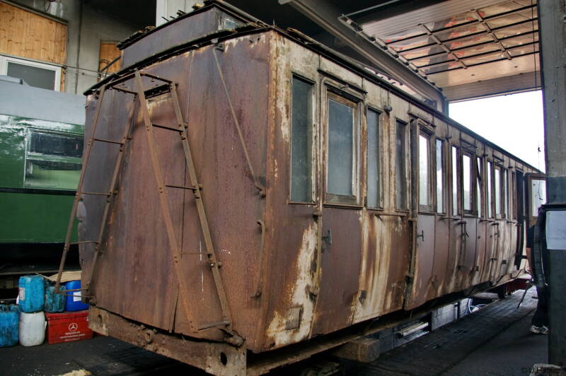 dreiachsiger Abteilwagen III.-Klasse / hergestellt von der Waggonfabrik Fuchs in Heidelberg / ex. DRG, Lagerschuppen